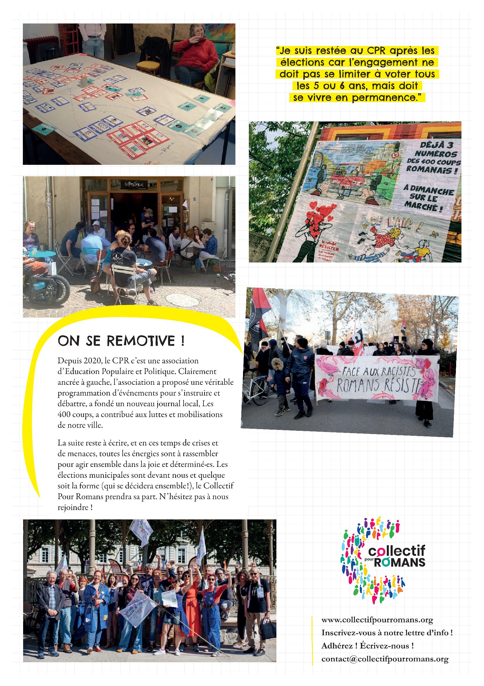 Ce livret a été réalisé par des membres du Collectif Pour Romans, aux profils variés, qui ont vécu 2020 à des places et des moments différents. Ils et elles ont été accompagné·es par une camarade formée aux outils d’Éducation Populaire :